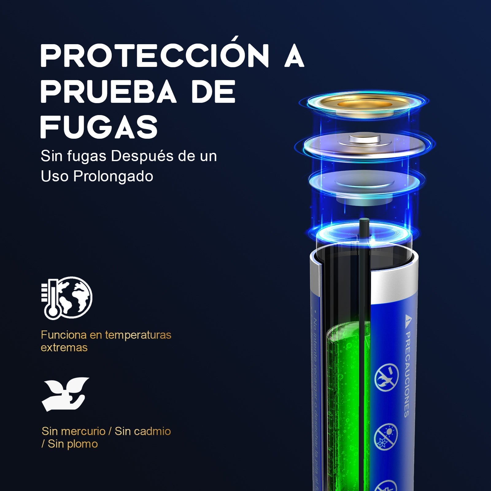 Prevención de Fugas: La tecnología mejorada a prueba de fugas evita eficazmente el cortocircuito de la batería, las fugas y garantiza un uso seguro